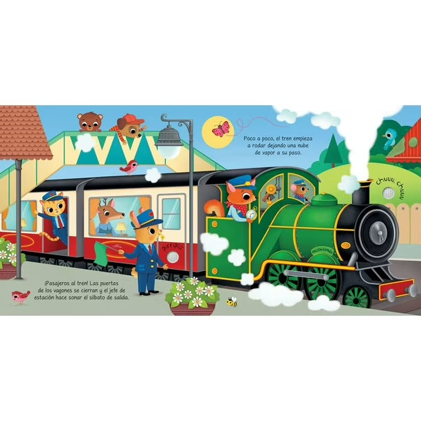 Un libro pensado para las manos y los oídos de los más pequeños. En Así suenan los trenes los niños y niñas podrán presionar los botones de cada página para escuchar los sonidos característicos de diferentes trenes, mientras las coloridas ilustraciones facilitan la identificación de ambientes y acciones.