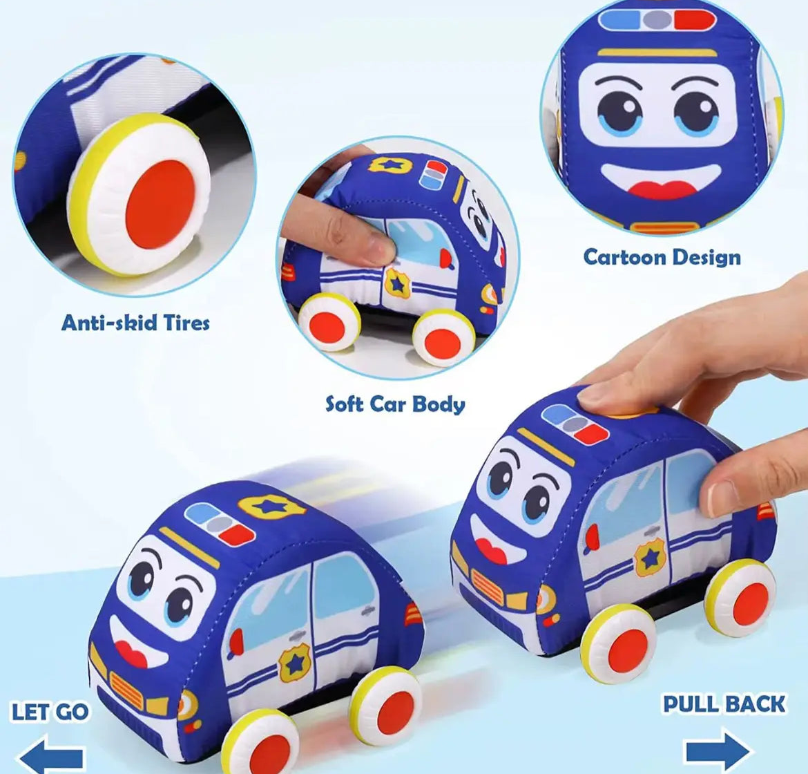 Incluye 4 Autos plush de tela lavable y 1 alfombra de tela
