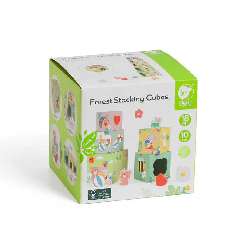 Cubos apilables con temática de bosque de Classic World es un juguete educativo que ayuda a los niños y niñas a aprender sobre clasificación de formas, números, tamaños y elementos del bosque, como plantas, animales e insectos.