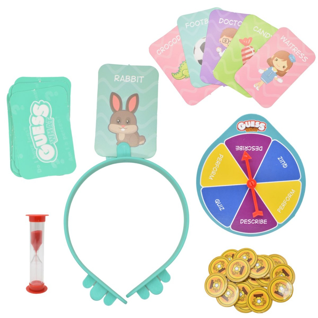 Incluye: 46 cartas con diferentes imagenes y 2 con guía de preguntas, vincha para colocarse el jugador, temporizador de arena, rueda giratoria con desafios y monedas de recompensa.