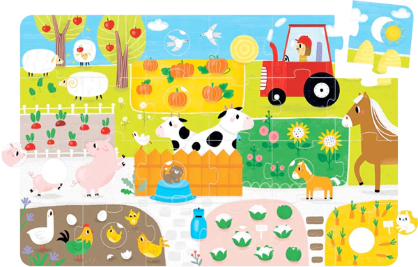 Puedes empezar armando las escenas de rompecabezas más pequeñas con varios animales de granja y verduras. Luego, combínalas para formar una imagen gigante y junta las piezas redondas. ¡Puedes mezclar las piezas redondas para mayor diversión y colocar animales o verduras en lugares inusuales! También puedes nombrar los animales y plantas que aparecen en la ilustración o jugar a adivinanzas: adivina qué animal vuela, qué crece en la tierra y qué objeto hace el sonido "brum, brum”.